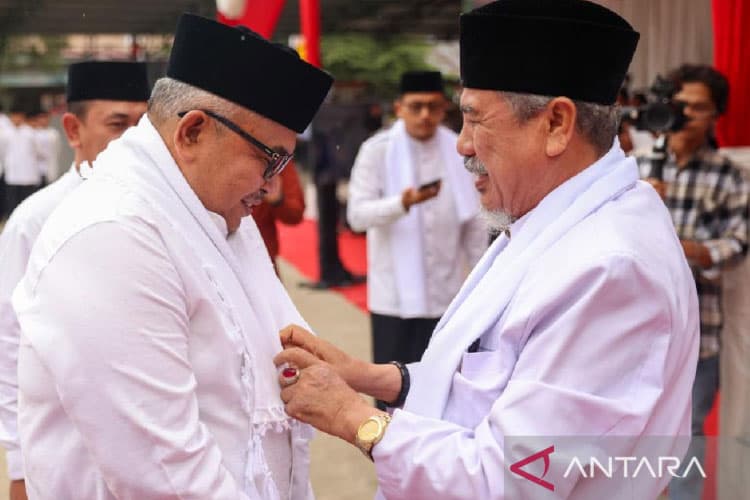 TIMES Blitar/Pimpinan pesantren Insafuddin Banda Aceh memberikan kain kepada Sekda Aceh Bustami Hamzah usai peringati Hari Santri, di Banda Aceh, Selasa (24/10/2023). (FOTO: ANTARA/HO/Humas Pemprov Aceh)