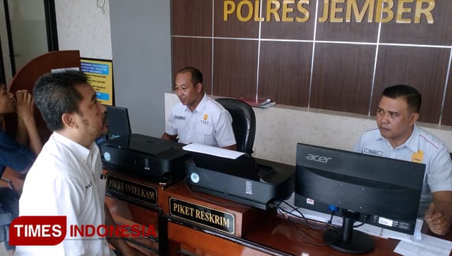 TIMES Blitar/Wakil Ketua Bidang Litbang dan IT DPD Partai Perindo Kebupaten Jember, Ahmad One Prastiono saat melaporkan Ketua DPD Partai Perindo Kabupaten Jember Hanung Prijobodo ke Polres Jember, Senin (6/5/2019). (FOTO: Dody Bayu/TIMES Indonesia)